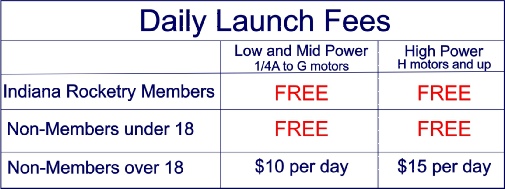 Note: there is a family cap of $15 for low power launch fees and $25 for high power launch fees; no family, regardless of age, number of fliers, power level, or membership status will pay more than $15 to fly low power or $25 if one or more members are flying high power.